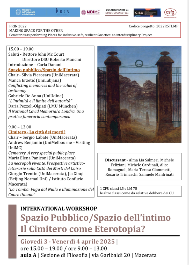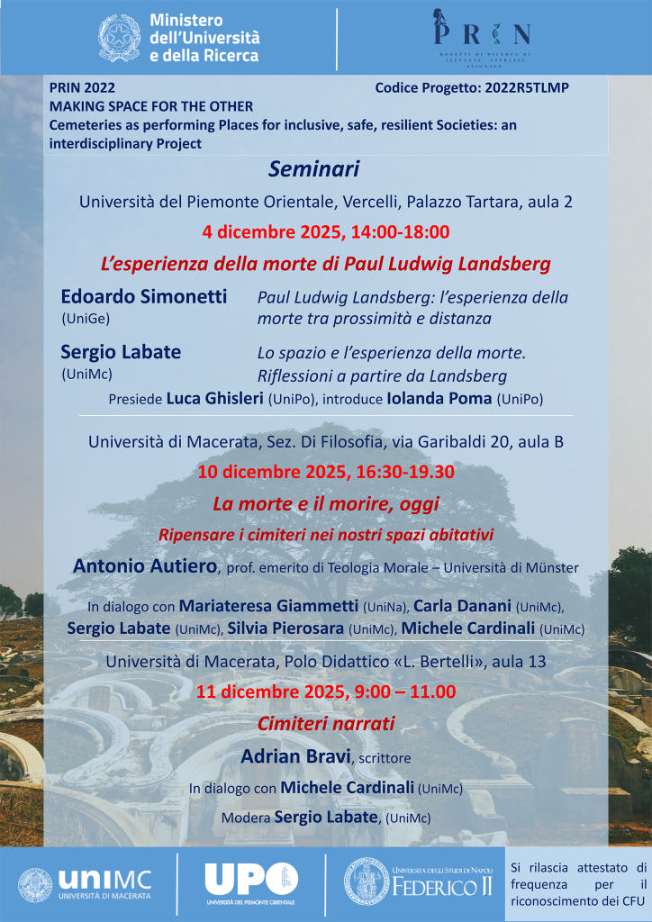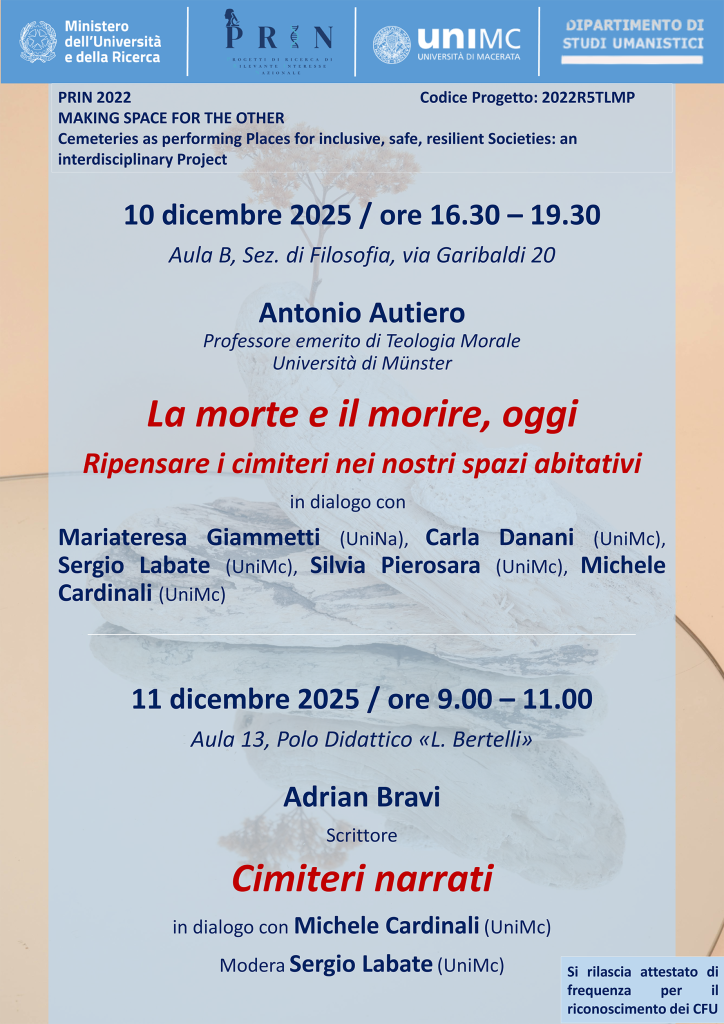 I convegni organizzati nell’ambito del progetto costituiscono uno spazio di confronto e di elaborazione collettiva sui temi della ricerca. Attraverso il dialogo tra discipline diverse – dalla filosofia all’architettura, dagli studi urbani all’antropologia – questi incontri mettono al centro il rapporto tra spazio, morte e forme della convivenza contemporanea.